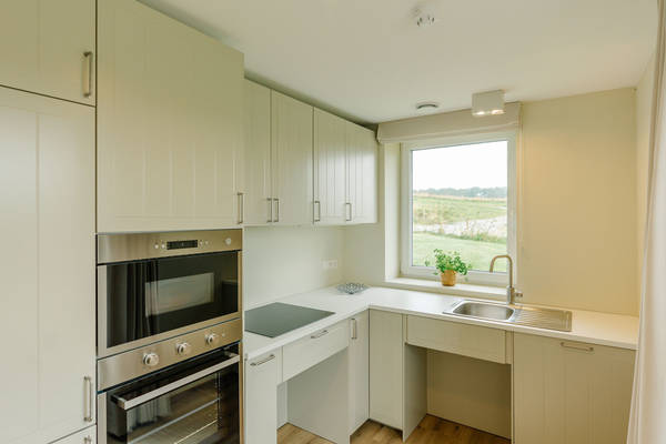 • Gelijkvloers toegankelijk gedeelte: volledig drempelloos en geschikt voor personen met beperkte mobiliteit, met extra badkamer die rolstoeltoegankelijk is.
