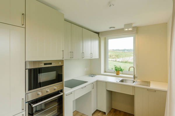 Gelijkvloers toegankelijk gedeelte: volledig drempelloos en geschikt voor personen met beperkte mobiliteit, met extra badkamer die rolstoeltoegankelijk is.