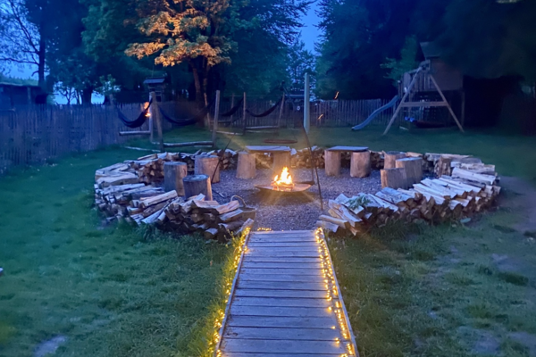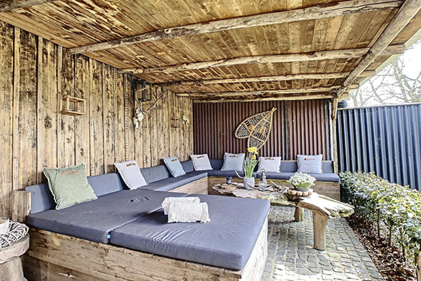 Buiten geniet u van een ruime, volledig omheinde privétuin van 1.000 m² – ideaal voor kinderen, met een heuse kinderboerderij, – aangevuld met gezellige zithoekjes, een kampvuurkring en een speeltuin.