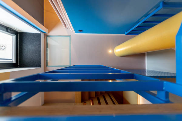 2 kamers bestaan uit 4 slaapplaatsen met elk hun douchekamer, en 1 grote kamer met 6 slaappplaatsen, op verschillende niveau's en deels toegankelijk via ladders.