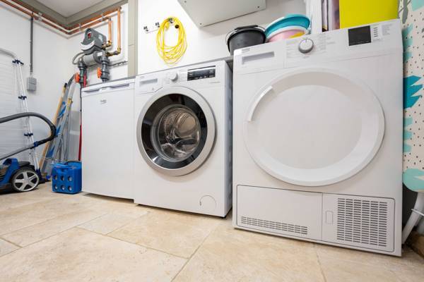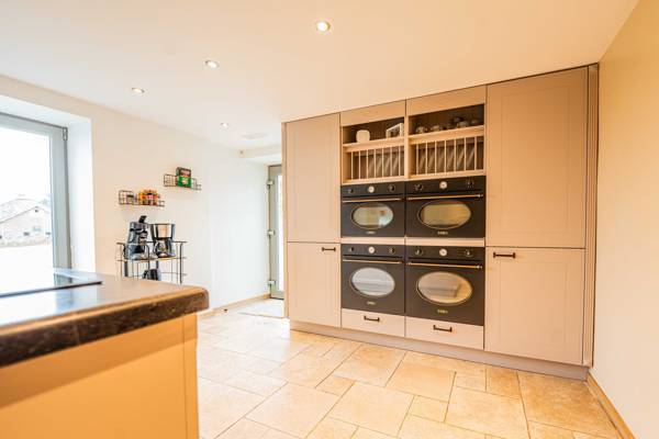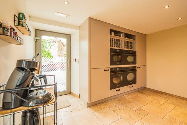 In de modern ingerichte woonkamer staat een eettafel met voldoende stoelen. De luxe keuken is ingericht met alles wat u nodig heeft, o.a. een vaatwasser, 2 hete lucht ovens, 2 magnetrons, 2 koelkasten.